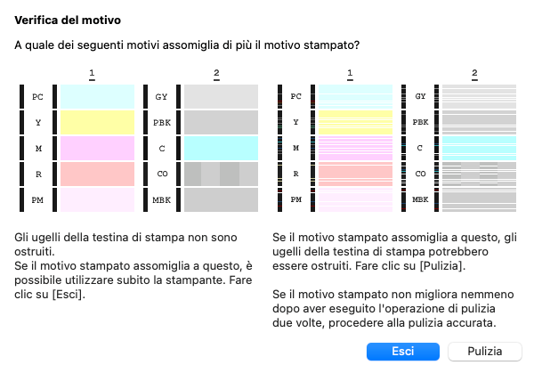 Il risultato della stampa di prova è come quello a sinistra, quindi non è necessaria una pulizia profonda, che peraltro non ho mai fatto da quando la posseggo.